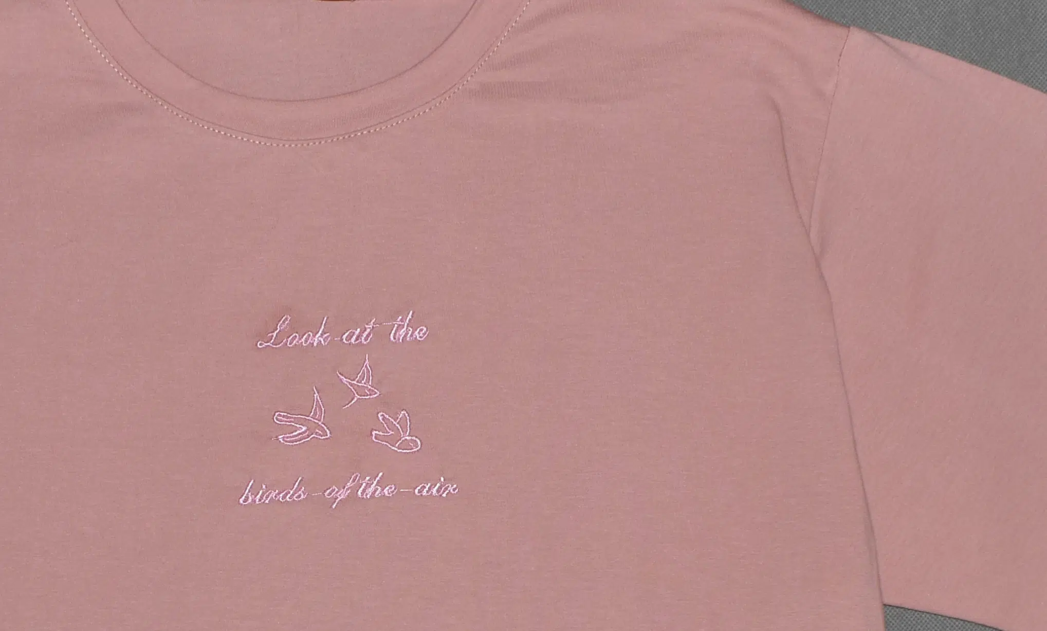 مثل نوشته گلدوزی شده این تیشرت (Look at the Birds of Air) رها باش و آزادانه استایل خودت رو داشته باش